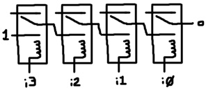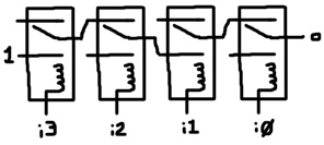 A relay series chain can be thought of as a pattern detector. The 4-input AND gate only produces a 1 signal if it detects the pattern 1111. To detect an arbitrary pattern you simply need to adjust the wiring on those relays that look for 0’s. For instance, this circuit detects the pattern 1010: