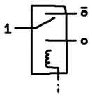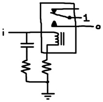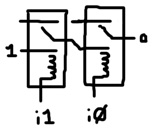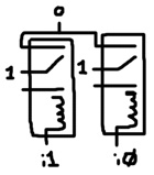 The third parameter, r, instructs Tofu to instantiate a relay. Relays accept the 4 nodes discussed above: coil, lever, normally-disconnected and normally-connected. When the coil node is 0, the lever and the normally-connected nodes form a conductive pathway. When the coil node is 1, the lever and normally-disconnected nodes form a conductive pathway. One way to think about is like this: