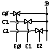 NOR is very similar to AND. The relays are chained in series forming a path from power through the levers and the normally-connected nodes. The inputs are the coils. If any of the levers are flipped, the chain will be broken. All inputs need to be 0 for the output to be 1. NOR can be thought of as a pattern detector looking for all zeros (a zero detector). The similarity to AND follows from De Morgan’s Law: !(A | B) = !A & !B.