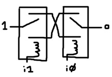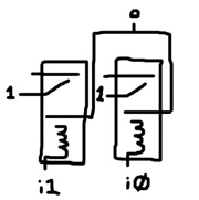If you test it, it will certainly appear to work; however, this circuit is dangerous. Up until now, inputs were always connected to the coils of the relays. Meaning, the output was fully decoupled from the input. There was no way a signal could inadvertently propagate from the output back to one of the inputs. The coil is simply not connected to any of the other terminals of the relay. But, in this circuit, if node i1 were energized and the output node were energized by some other circuitry that it’s connected to, node i0 could get energized. Power can flow in this AND gate in reverse. If you use this optimization, you must take that possibility into consideration.