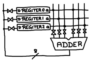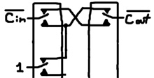 There are a few things you should note from this. First, you can break up long lines with carriage returns. The parser uses the colon to determine when the def parameter list ends. For the body of def, the parser uses the lengths of the parameter lists of the defined electronic components to determine when a node list ends. Unfortunately, this means that you can only use electronic components that were defined above it. Meaning, for example, you can’t define adder2 before defining fullAdder. Second, there is no looping syntax. It would be nice to loop 8 times, connecting full adders together to produce adder8. Instead, doubling components up is used.