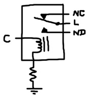 A relay physically has 5 terminals, but we can connect 1 end of the solenoid to a resistor and connect the resistor to ground. This produces a component with 4 logical terminals: coil (C), lever (L), normally-disconnected (ND) and normally-connected (NC). To energize the solenoid, terminal C must be connected to the power voltage.
